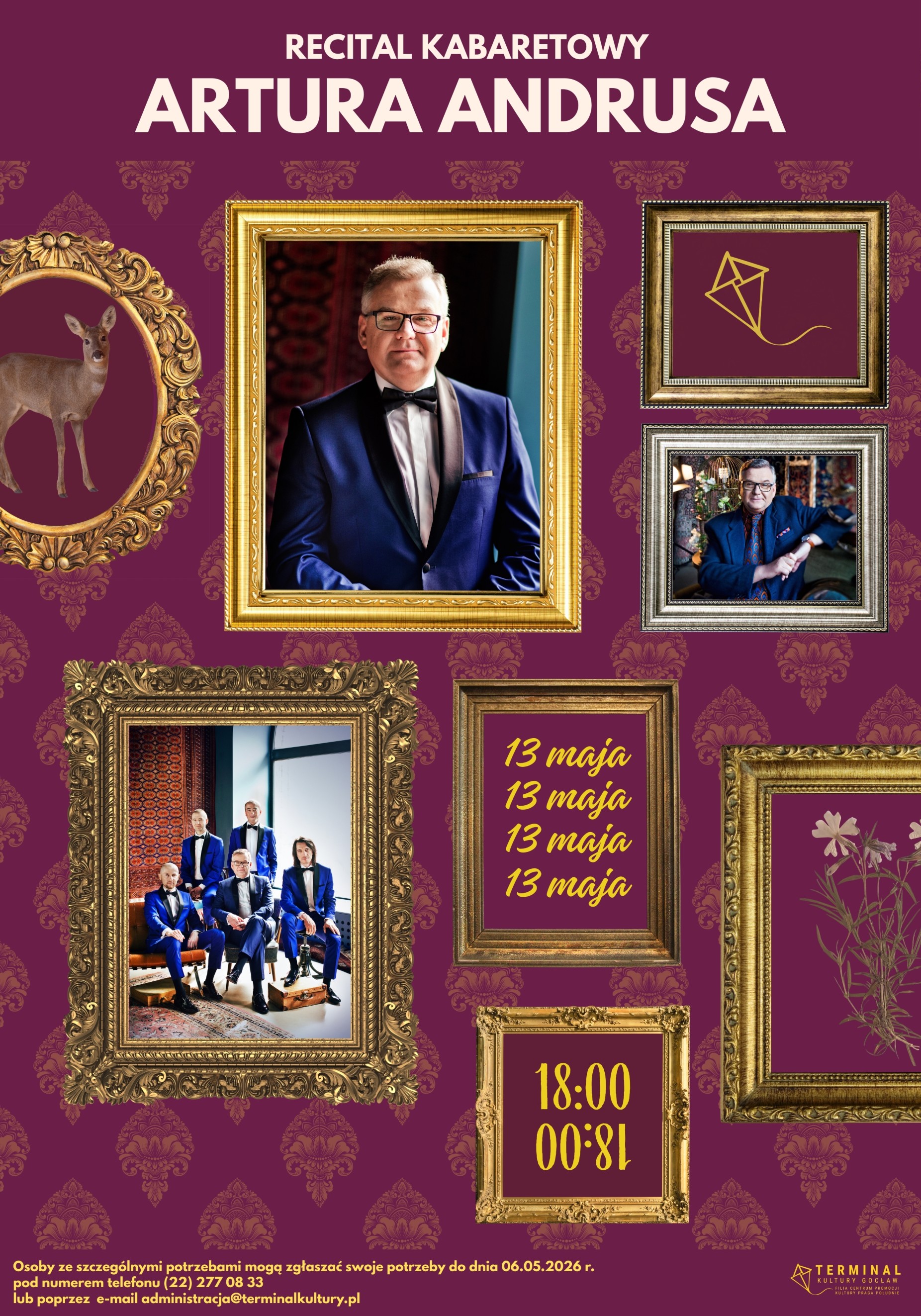 Zapraszamy na Recital Kabaretowy Artura Andrusa, w którym usłyszymy znane, lubiane, wciąż przez publiczność oczekiwane utwory, będące już niekwestionowanymi przebojami piosenki kabaretowej. W repertuarze pojawią się utwory ze wszystkich albumów długogrających Artysty oraz wiersze, pisane specjalnie na potrzeby koncertu w Terminalu!